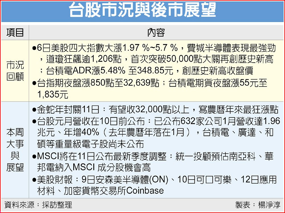 綜合富邦投顧董事長陳奕光、台新投顧副總黃文清等專家看法,台股六大利多掛保證,封關有望收在32,000點以上,且2月仍有望再突破33,000點改寫歷史新高,6日的盤中劇烈修正,已提前消化節前賣壓,在美股科技股報復性反彈,台股本周將重返10日均線約32,147點。