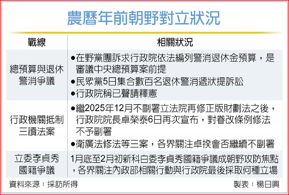 立法院2月進入新會期,但在月底開議、甚至新年之前,朝野僵局非但無緩和,硝煙反更濃,除固有的總預算、軍購紛爭外,法案不副署戰火擴大,加上立委國籍爭議、地方大選角力等,外界對年後新氣象悲觀,關稅協議能否成破冰關鍵因素,受矚目。
