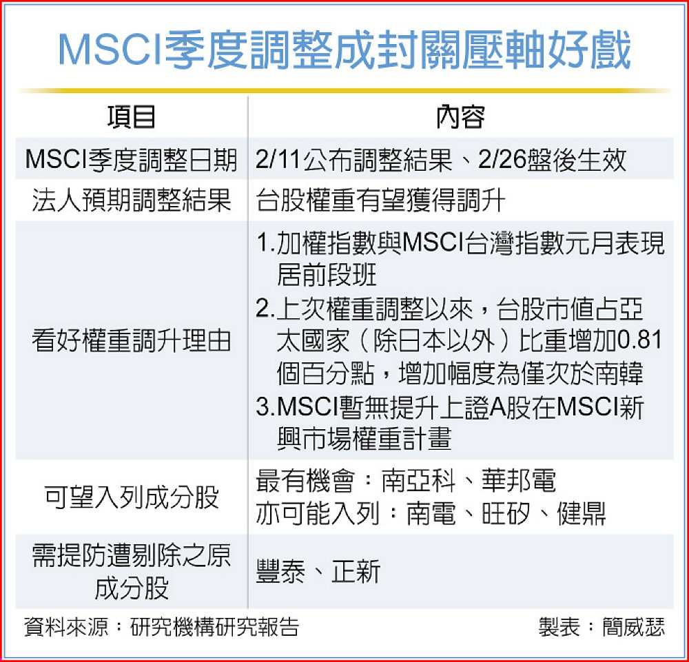 台股農曆年封關前最後三個交易日,MSCI季度調整將於2月11日封關當日登場,扮演台股金蛇年壓軸好戲。統一投顧、兆豐國際投顧一致預料,台股權重本次將獲調升,其中,南亞科、華邦電等有機會新納入成份股,展現記憶體族群大行情市值揚升的威力,將是台股金馬年開紅盤焦點。