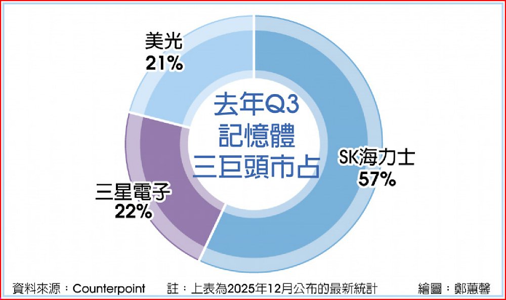 隨著HBM成為AI運算不可或缺的核心元件,三星與主要競爭對手SK海力士在HBM4供應上的競爭勢將進一步升溫。研究機構Counterpoint最新資料顯示,去年第三季SK海力士在HBM市場仍握有57%市占率,高於三星的22%及美光的21%。