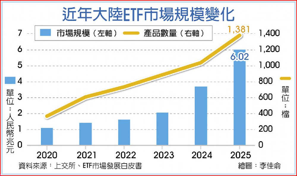 綜合陸媒報導,上海證券交易所近日公布「ETF行業發展報告(2026)」指出,境內ETF市場於2025年間先後突破4兆元、5兆元與6兆元關卡,全年資金呈現加速流入態勢,市場規模與產品數量同步創下新高。