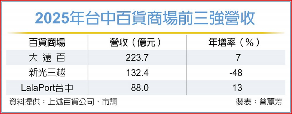 2025年受新光三越台中店氣爆停業影響,台中百貨市場規模一度萎縮至860億元,不過隨漢神洲際今年4月加入戰局,加上新光三越台中店營運動能回溫,百貨業界預估,今年台中百貨市場規模可望一舉衝破千億元大關。