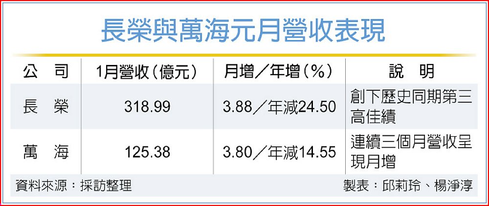 長榮1月合併營收318.99億元,月增3.88%、年減24.5%,創同期第三高紀錄;萬海1月營收125.38億元,月增3.8%、年減14.55%,連續三個月營收呈現月增走勢。