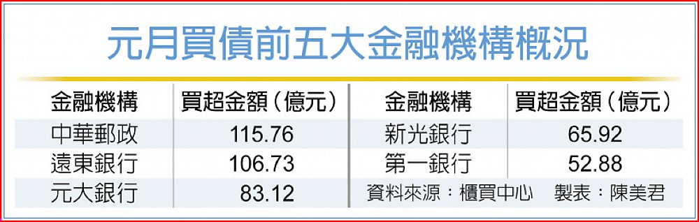 櫃買中心資料顯示,以交易為目的的證券商,仍為賣債主力。其中,富邦證券賣超194.47億元,登上元月「賣債王」寶座,凱基證券賣超176.04億元居次;大型民營銀行中國信託銀行異軍突起,1月大舉拋售台債124.39億元,搶下第三名,為前五大賣債金融機構裡、唯一一家銀行;元富證券與元大證券,1月賣超108.98與83.40億元,分居第四與第五大。