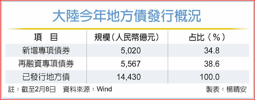 其中,地方債密集發行是大陸流動性面臨考驗的因素之一。據統計,僅2月前兩周,大陸地方債繳款規模就已突破9,500億元,較1月全月增近18%,並刷新自2025年7月以來的單月高點。Wind數據顯示,截至2月8日,大陸各地已發行地方債券達14,430億元,較2025年同期增長約127.7%。