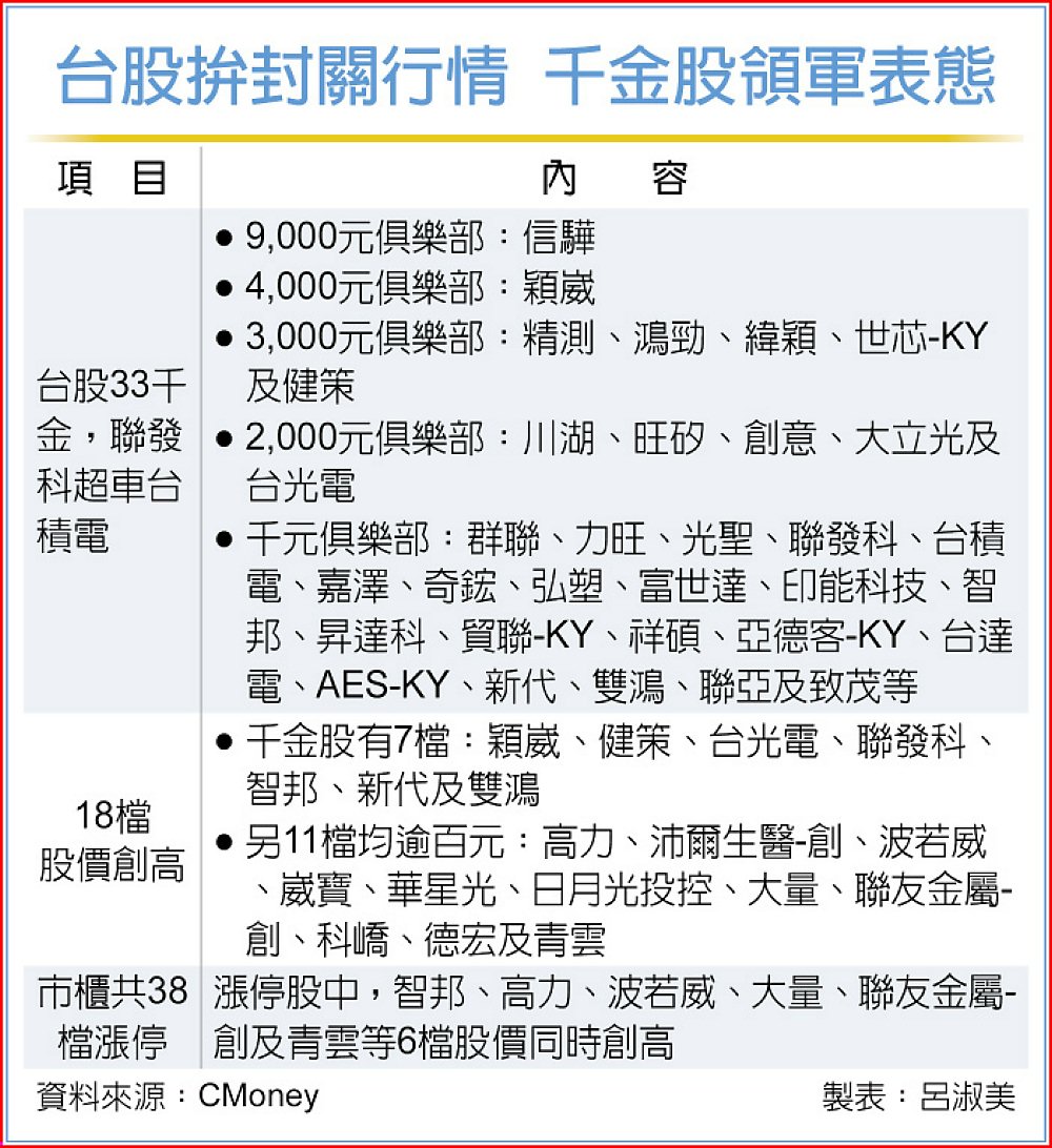 市場多軍在封關之前奮力一搏,代表多頭人氣指標的千金股,9日重返了「33」千金,台股是否可以同步收在33,000點,備受市場的期待。