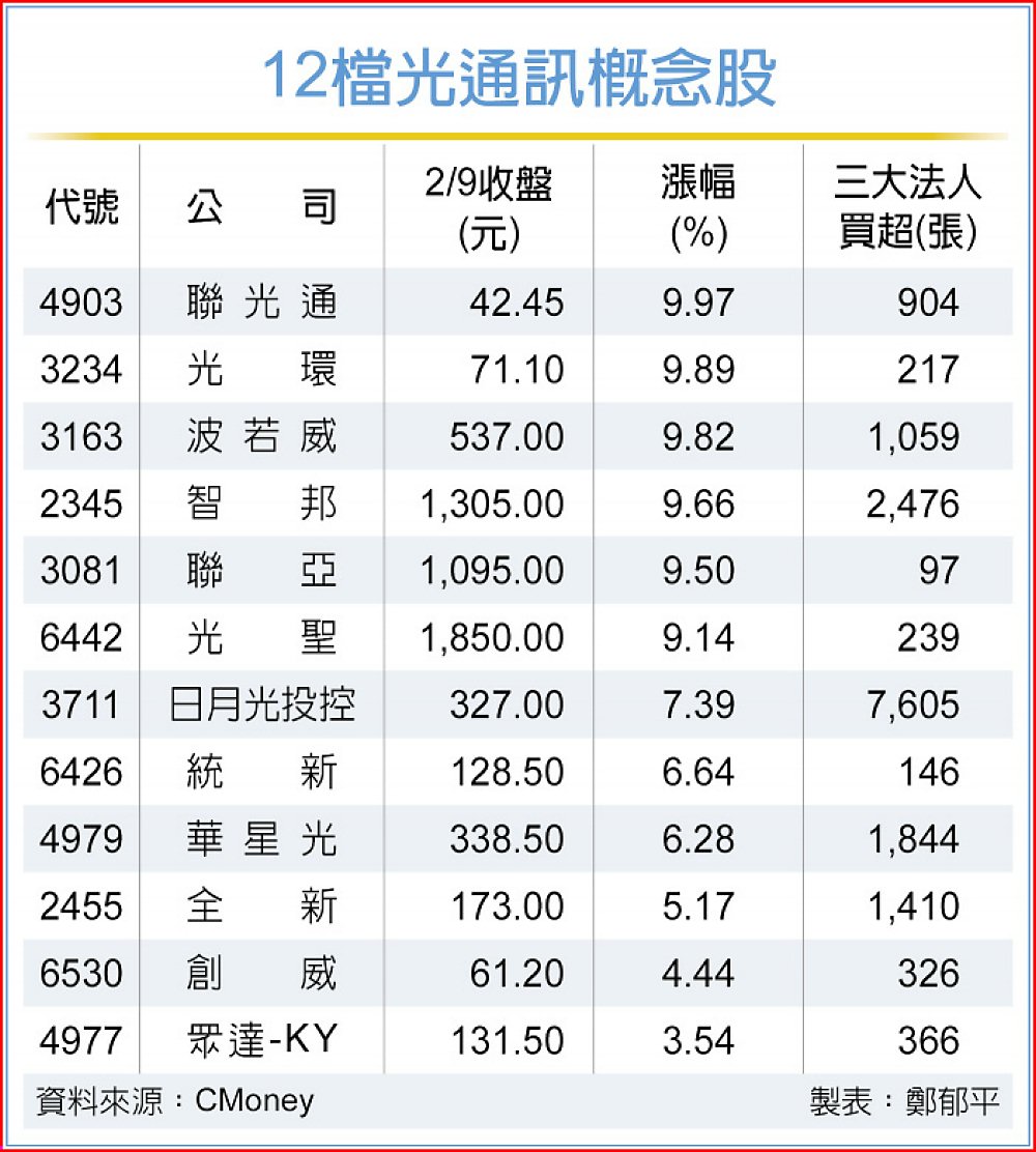 台股相關廠商同步沾光,CPO光學概念股成為台股9日盤面多頭焦點,聯光通、光環、波若威、智邦4檔齊飆漲停,其中波若威及智邦雙雙衝出歷史新天價,本月來分別大漲了17.76%、17.04%。聯亞、光聖盤中也一度觸及漲停價,日月光投控、統新、華星光、全新則是大漲超過半根停板,日月光投控、華星光也改寫了歷史新高價。