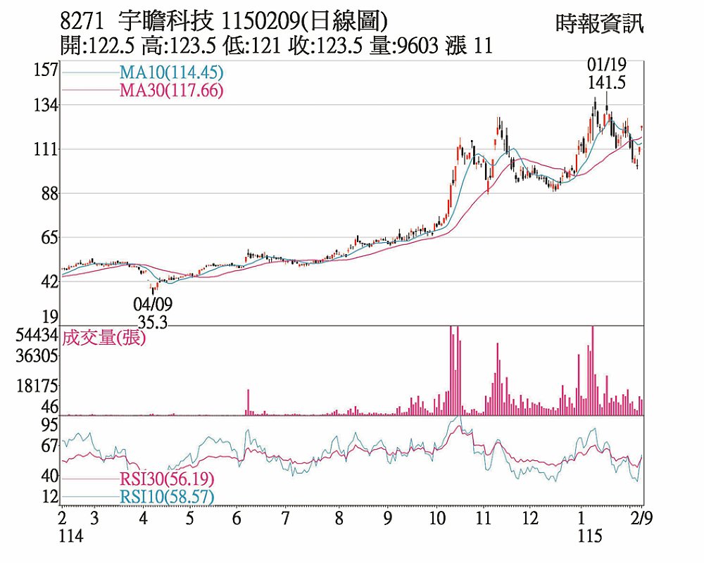 記憶體模組廠宇瞻(8271)9日一開盤即強勢攻上漲停板123.5元,一路鎖住直至終場,並收復月線支撐。