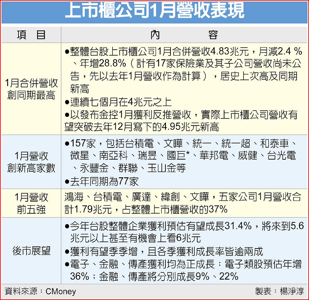 法人以目前金控已發布1月獲利表現來觀察,均呈現成長,顯示金融業營收增加,加上去年農曆春節在1月底、營業日少於今年,且1月新台幣僅小貶3分,且全球股市多頭,壽險業來自股市操作應有獲利,推估整體1月上市櫃公司的實際營收極可能創下歷史新高,超越2025年12月的4.95兆元紀錄。