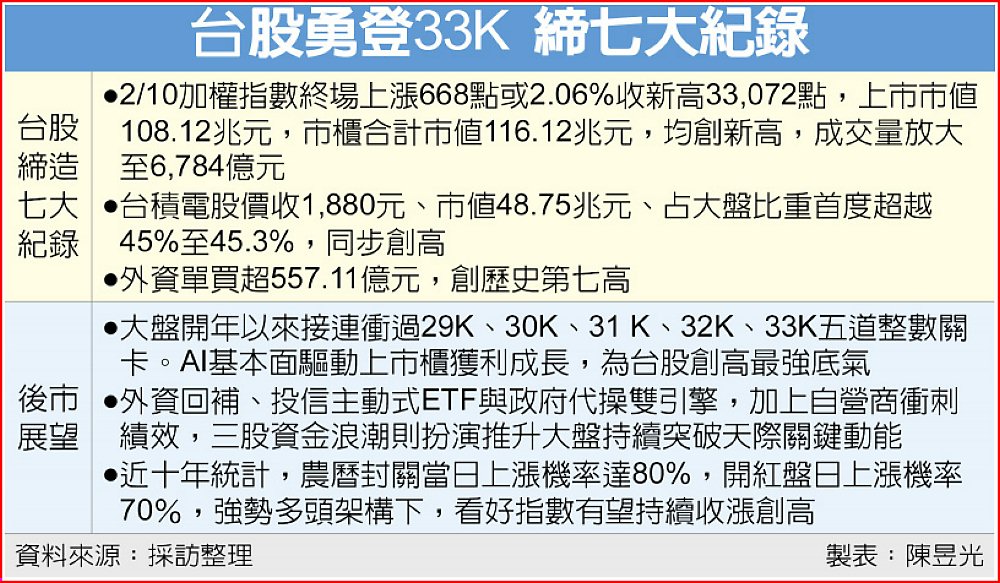 外資積極回補,一舉敲進史上第七大買超,激勵台股10日大漲668點收當日最高33,072點再創歷史新高,權王台積電營收攀峰,股價改寫新天價1,880元,市值衝上48.75兆元,占大盤比重來到45.3%高峰,上市市值108.12兆元,市櫃合計市值飆116.12兆元刷多項紀錄,尤其台積電鉅額交易直逼2,000元與ADR走揚,金蛇年有望亮麗封關。