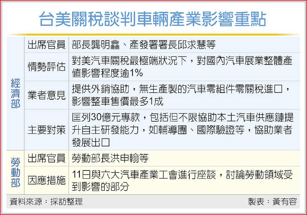 行政院副院長鄭麗君率隊赴美,台美關稅談判協議進入最後關鍵之際,經濟部與勞動部10日連手邀集汽車產業代表商議。經濟部長龔明鑫指出,經濟部高度重視汽車產業所受影響,特別委請智庫評估,研判對美汽車進口關稅最極端狀況,將影響國內汽車產業產值逾1%。為此,經濟部擬匡列30億元專款,後續產業有需求時可提供協助。