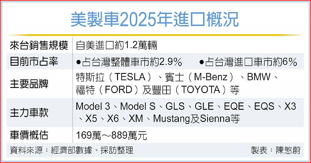 經濟部與勞動部接力邀集汽車業座談,市場解讀美車零關稅可望於近日底定。據經濟部統計,去年美國進口車約1.2萬輛,占國內總市場僅約2.9%,主要包括特斯拉、賓士、BMW、福特等品牌的部分車款。雖占比不高,但車輛公會憂心「牽一髮動全身」,一旦零關稅大門開啟,後續效應恐如滾雪球般擴大,衝擊國產車生存空間。