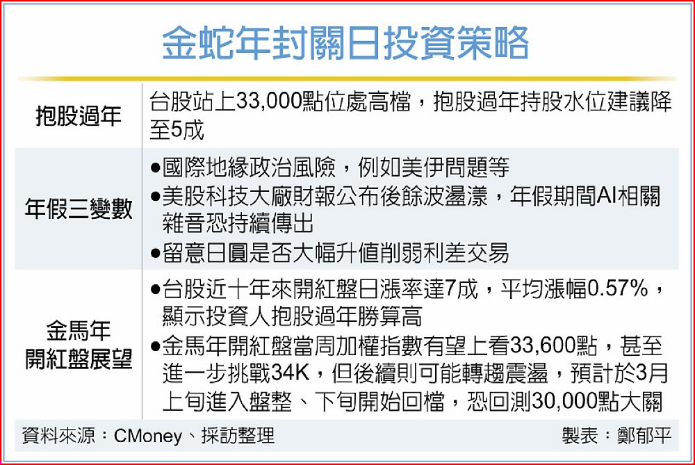 台股愈接近封關日行情愈旺,加權指數本周短短兩天飆漲1,290點,10日飛越33,000點整數大關,11日台股金蛇年將封關,並迎接長達11天假期。法人建議,台股金蛇年封關前夕甩尾攻上33,000點的歷史高檔,持股水位建議調降至約5成,規避年假期間市場風險。