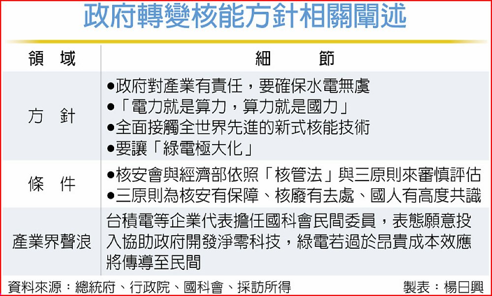 隨後,在總統府1月22日舉行氣候變遷對策委員會第6次委員會中,總統賴清德特別提到,減碳也要「顧企業」,政府將做產業的後盾,協助對接國際標準,知道企業都很關注能源議題,所以將讓「綠電極大化」。外界關注,相關說法或是為重新傾向核電埋下伏筆。
