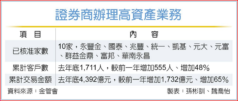 拚亞資中心金管會再鬆綁。證期局副局長黃仲豪10日宣布,將推二大項放寬措施,把證券業承作高資產業務門檻與銀行拉齊,一證券業申請高資產業務的資格條件,二可承作的高資產客戶範圍加大,預計客戶層可增1.3萬人,預計3月中上路,券商資格可望從現行十家再增加五家。