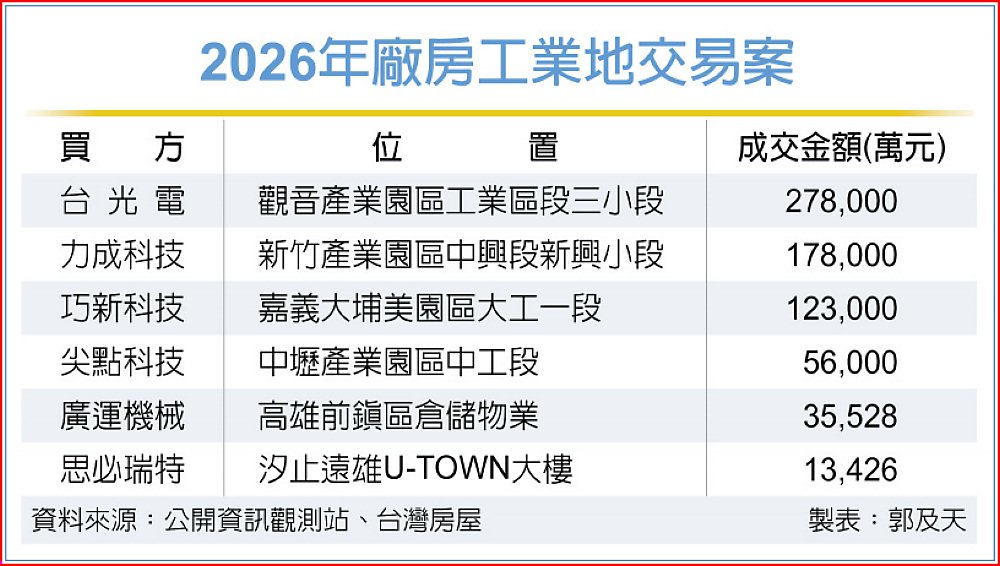 台灣經濟成長率創15年新高、台股持續創高,科技業積極擴廠,今年以來多家科技業大手筆擴廠,台光電以27.8億元向遠東新買下桃園觀音產業園區土地逾萬坪廠房,力成科技以17.8億元購置新竹產業園區購入6,117坪的廠房,尖點科技、廣運機械等企業也投入逾3億元購置工業地產,累計今年以來上市櫃公司購置工業地產逾70億元。