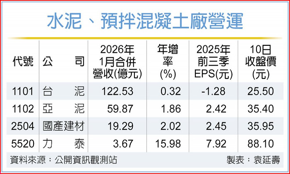 農曆年節前各項工程趕工,兩岸市場需求旺,包括台泥(1101)、亞泥(1102)、環泥(1104)、國產建材(2504)、力泰(5520)等水泥及混凝土業者,1月營收年成長。
