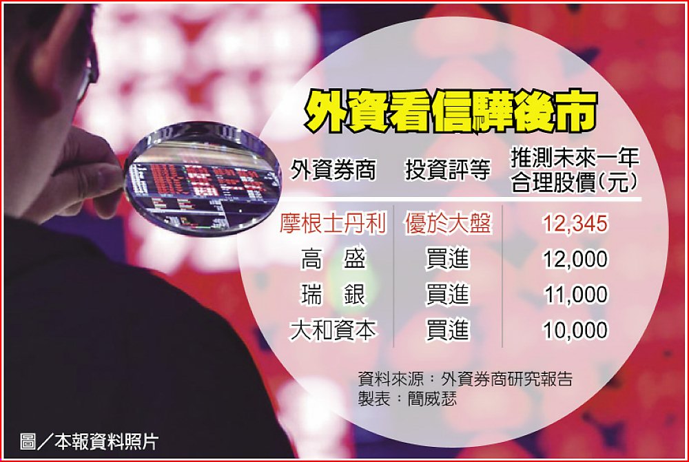 外資早在封關前約一個月左右,便展開股王目標價追逐戰。大和資本、瑞銀、高盛證券賦予的股價預期分別為10,000元、11,000元、12,000元,凱基投顧、金控旗下投顧給予的推測合理股價也都在萬元以上,摩根士丹利證券於農曆年前喊出12,345元「同花順」目標價,躍居內外資最高。