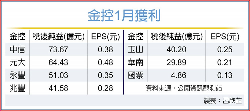 中信金控1月稅後純益73.67億元,每股稅後純益(EPS)0.38元。中信金表示,子公司中信銀行放款及財富管理業務動能強勁,且有聯貸手續費挹注,淨利息與手續費收入表現優異,單月稅後獲利58.91億元,繳出歷年同期最佳成績,且年成長達46%,主要因核心業務動能表現良好及淨利差擴大。