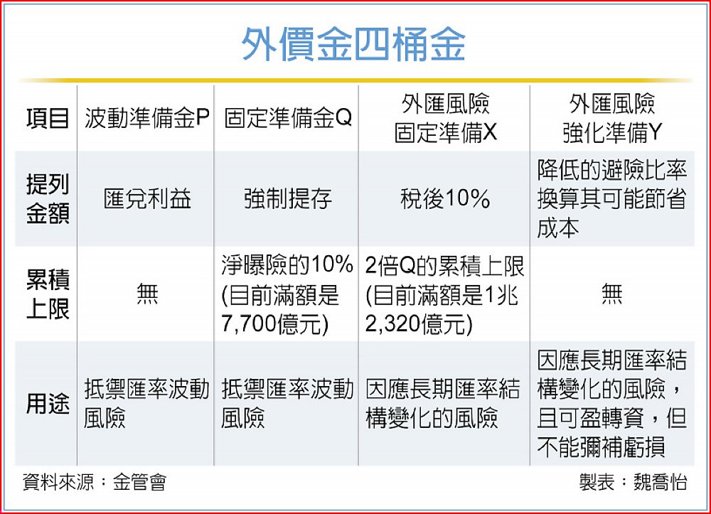 過去壽險為抗匯率波動,年年花大錢避險,今年起金管會將匯率會計制度改變,導向自我保險的做法,加速累積外價金增強抵禦力。金管會規劃,未來外價金會有四桶金,包括負債項的波動準備金P、固定準備金Q,及權益面的外匯風險固定準備X與外匯風險強化準備Y;其中固定準備金Q及外匯風險強化準備Y為新申設項目,只有符合條件的壽險公司,才可拿來做新一代清償能力制度TIS的還款。