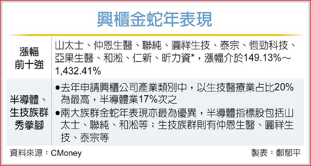 台股金蛇年大放異彩,金融市場百家爭鳴,不僅上市櫃AI題材熱,興櫃小尖兵也搶搭順風車,統計金蛇年興櫃市場共計21檔繳出「翻倍賺」佳績,其中,櫃買家族兩大主力半導體、生技醫療族群撐起半邊天,山太士大啖先進封裝商機,股價全年瘋狂飆漲逾14倍,成興櫃最大黑馬。