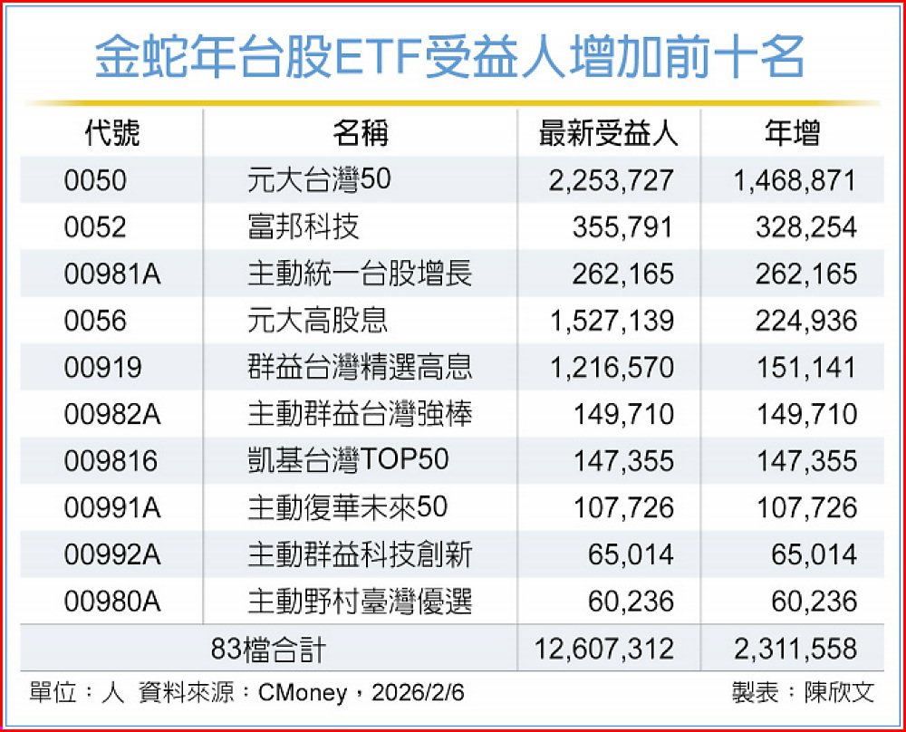 此外,金蛇年的台股ETF受益人數創高,檔數也創新高,集保戶股權分散統計最新資料顯示,台股ETF目前檔數來到83檔,總受益人在金蛇年增加231.15萬人,總人數來到1,260.7萬人,觀察台股ETF受益人數增加前十大,以市值型元大台灣50增加146.8萬人最多,主動式有主動群益台灣強棒、主動統一台股增長、主動群益科技創新等共5檔主動式台股ETF上榜人氣最旺,高息型元大高股息與群益台灣精選高息也上榜。