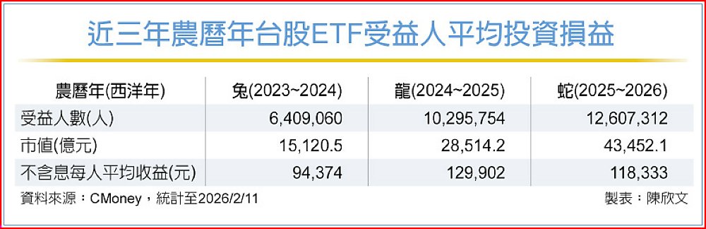 台股ETF投資持續發熱,特別是在主動式台股ETF問世後,更受投資人青睞,統計金蛇年不含配息所得,平均每位投資人賺逾11.83萬元,雖然平均收益不如金龍年時的12.99萬元,但已是連續兩年逾10萬元。