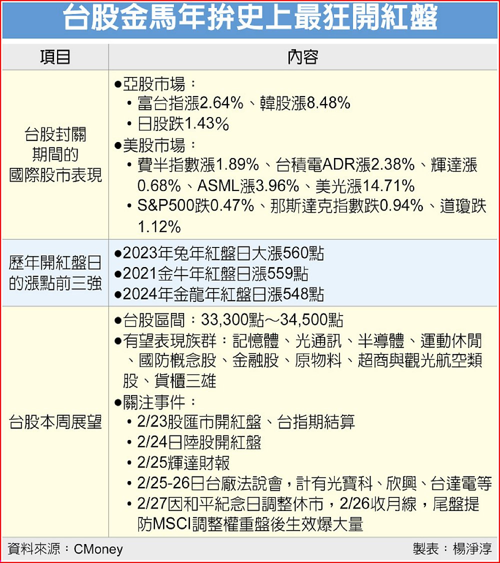 台股農曆年封關期間,台積電ADR上漲2.38%、富台指數期貨勁揚2.64%,法人預估,23日金馬年開紅盤若如實反映漲幅,加權指數將衝破34,000點大關,有望挑戰歷年來最狂的開紅盤漲點,當天台指期也將風光拉高結算,台股26日收月線更有機會挑戰34,500點目標。