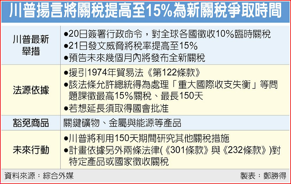 川普表示,將利用150天的期間研究其他「合法可行」的關稅措施,為了反制最高法院的關稅裁決,將「立即」把10%全球關稅提高到「完全合法且經過法律檢驗」的15%水平。(相關新聞見A2)