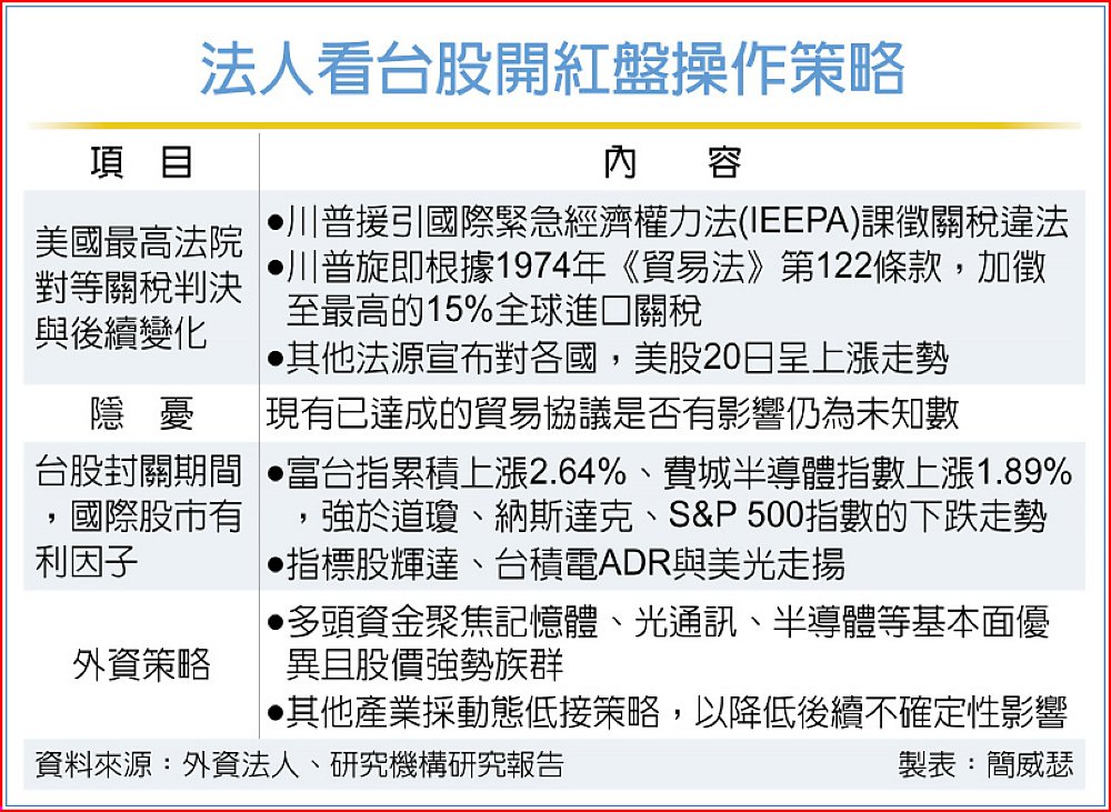 台股農曆年封關期間充斥「美式」風味,對等關稅風波再起,美股20日以上漲回應美國最高法院判決。外資分析師說,台股在費城半導體、富台指二大指數,與三大指標股輝達、台積電ADR與美光上揚帶動下,金馬開紅盤行情大有可為,但對等關稅後續不確定性浮現,操作策略必須更靈活:鎖定基本面優強勢族群、其他標的動態低接,以面對未來數周可預見的波動。