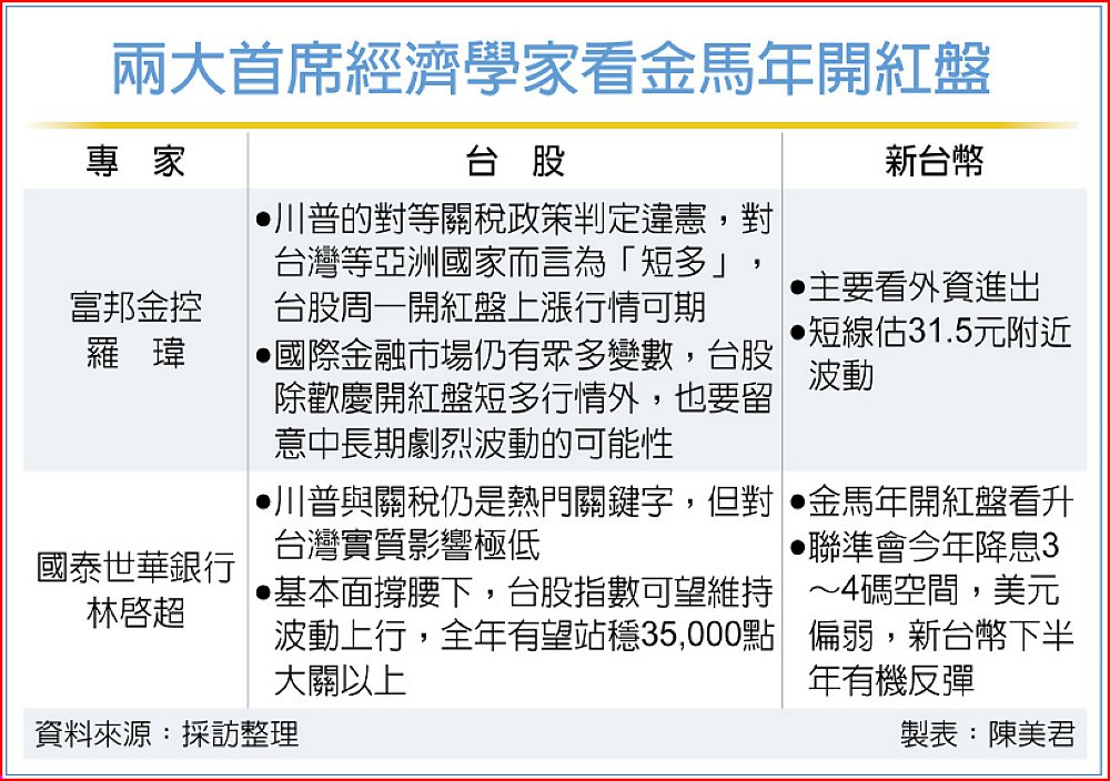 金馬年股匯市23日開紅盤,富邦金首席經濟學家羅瑋、國泰世華銀首席經濟學家林啟超均認為,美國最高法院駁回川普對等關稅政策,對台灣而言「是利多、不是利空」,開紅盤「馬上漲」可期,新台幣匯率則是有機會因台股帶動及外資匯入而看升。