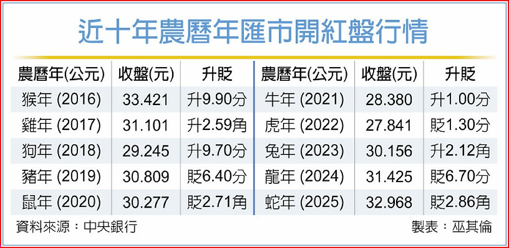 根據中央銀行統計,去年蛇年開紅盤日收在32.968元、重貶2.86角或0.87%,幾乎逼近33元整數,且創開紅盤史上第二大貶幅,僅次於2020鼠年重挫0.9%;今年馬年有台股紅包行情及作夢行情支撐,帶動新台幣開紅盤看升,關鍵在股市資金牽引,尤其是外資進出是關鍵。