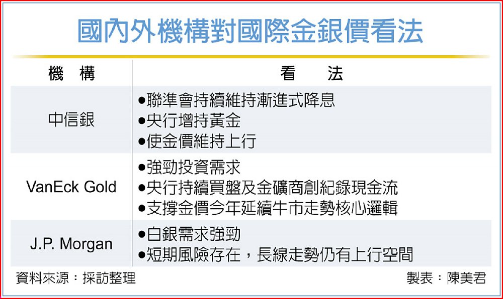 J.P.Morgan預估,白銀今年均價將達81美元,較去年大幅翻倍,反映其底部持續抬升。白銀需求強勁、工業用途擴張及美國關鍵礦物關稅不確定性解除,推動去年大漲逾130%,但市場仍具高波動,1月底因新任聯準會主席提名造成白銀暴跌27%。雖短期風險存在,但白銀試圖脫離金價陰影,長線走勢具上行空間。