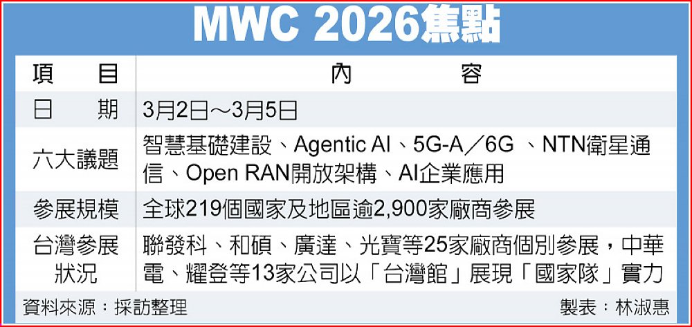 MWC 2026世界行動通訊大會即將於3月2日至5日在西班牙盛大舉行,台灣除了聯發科、和碩、廣達、光寶及中華電信等台廠組成的「台灣館」前進巴塞隆納展現「國家隊」實力之外,據了解,台灣擬與西班牙加泰隆尼亞太空研究所(IEEC)簽署合作協議,為台廠搶進歐系衛星供應鏈搭橋。
