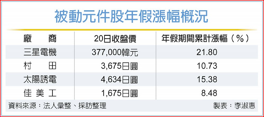 據法人統計,年假期間飆漲的被動元件股還包括村田、太陽誘電、佳美工等,累計漲幅分別達10.73%、15.38%、8.48%。
