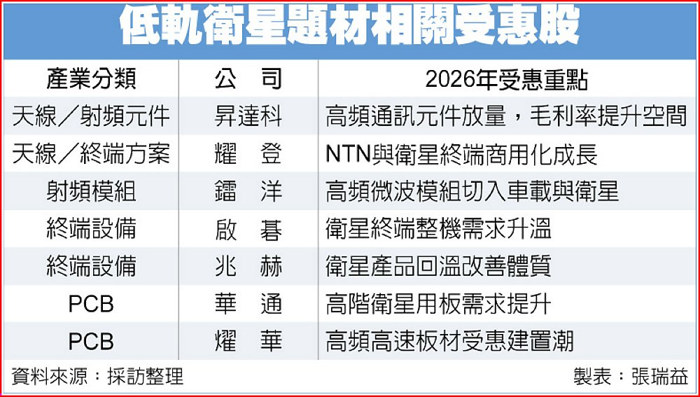 至於PCB供應鏈,華通與燿華受惠低軌衛星建置升溫、海外產能與認證進度推進,2026年衛星相關比重與接單動能被市場視為重要成長來源。整體而言,隨著Kuiper、Starlink等進入更規律發射與開通節奏,低軌衛星從天線射頻、地面終端到高階PCB,將在2026年為台系供應鏈帶來明確放量貢獻。