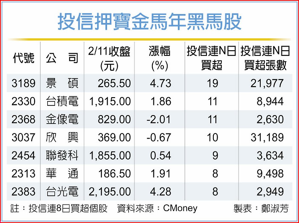台股金蛇年風光封關,三大法人趕在最後3個交易日齊力做多,順利將台股拱上33,605點,再寫新天價。投信及時啟動認錯行情並寫下連8日買超,押寶金馬年開紅盤的意味濃厚,由景碩(3189)領頭的7檔投信逾連8買個股,有機會坐享投信搭轎行情,乘金馬翱翔天際。