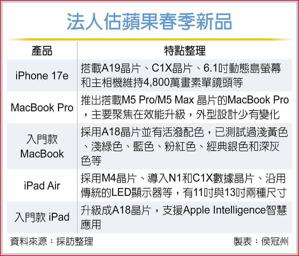 市場預期,蘋果將在這場活動亮相iPhone 17e、採用M5 Pro/M5 Max的MacBook Pro、A18 iPad、M4 iPad Air等新品;法人認為,蘋果新品齊出,將為台積電、大立光、玉晶光、鴻海、和碩、廣達、仁寶、晶技等蘋概股添利多、上半年營運有撐。