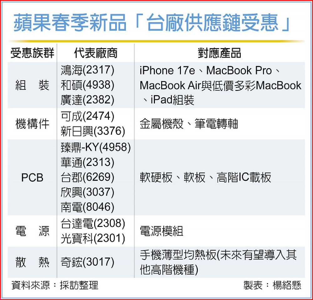 蘋果(Apple)3月4日舉行春季發表會,市場聚焦入門新機iPhone 17e,搭載次世代M5晶片的MacBook Pro、MacBook Air與低價多彩MacBook,並同步更新iPad產品線。在蘋果AI功能全面內建、終端硬體規格升級趨勢下,台鏈涵蓋組裝、機殼、軸承、PCB、電源與散熱族群,可望率先反映新一波拉貨動能,並挹注上半年營運成績。