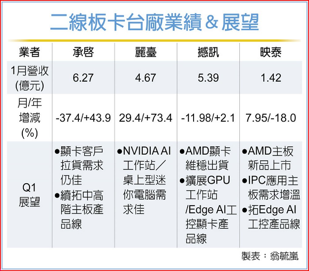 二線板卡廠緊抓第一季中國市場小旺季出貨潮,趕在農曆年前積極鋪貨,帶動相關台廠業者多有優於預期或符合預期的表現。其中,在中國市場業績比重高的如承啟(2425)、麗臺(2465)元月營收皆有相對強勁的雙位數年增動能,另聚焦AMD(超微)平台的撼訊(6150)及映泰(2399),則分別呈年增、月增表現。