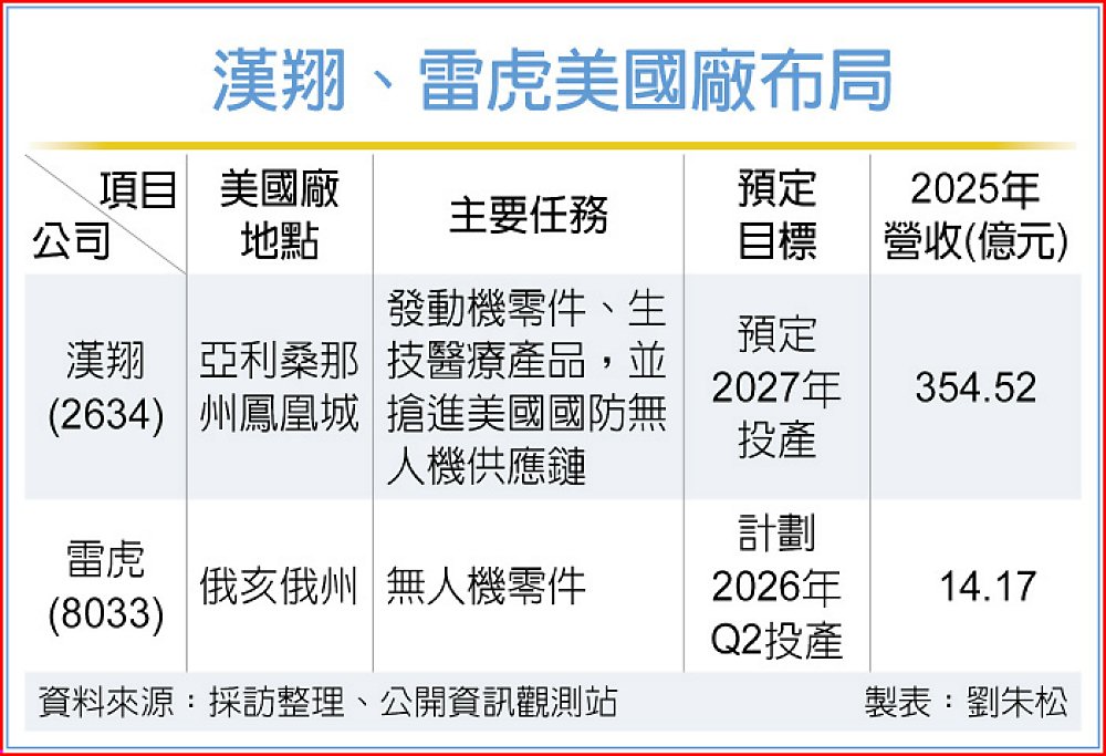 漢翔為因應美國《購買美國產品法》及「川普2.0」潛在關稅,於美國亞利桑那州鳳凰城設廠,已完成購置與裝機,該廠定位聚焦高價值發動機零件、生技醫療產品,並搶進美國國防無人機供應鏈,預計今年底小量產、明年正式投產。