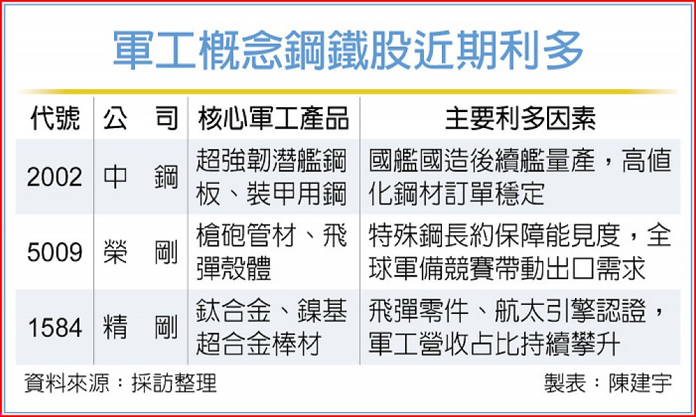 農曆春節過後,立法院新會期就可能將軍購特別預算付委,且隨著地緣政治態勢未減,加上「國艦國造」與「國機國造」進入交付高峰期,鋼鐵產業中具備特殊合金與高強度鋼板技術的「軍工概念股」成為開春市場焦點。法人指出,包括中鋼(2002)及台鋼集團旗下的榮剛(5009)、精剛(1584),將受惠於預算釋出的剛性需求,營運動能可望價量齊揚。