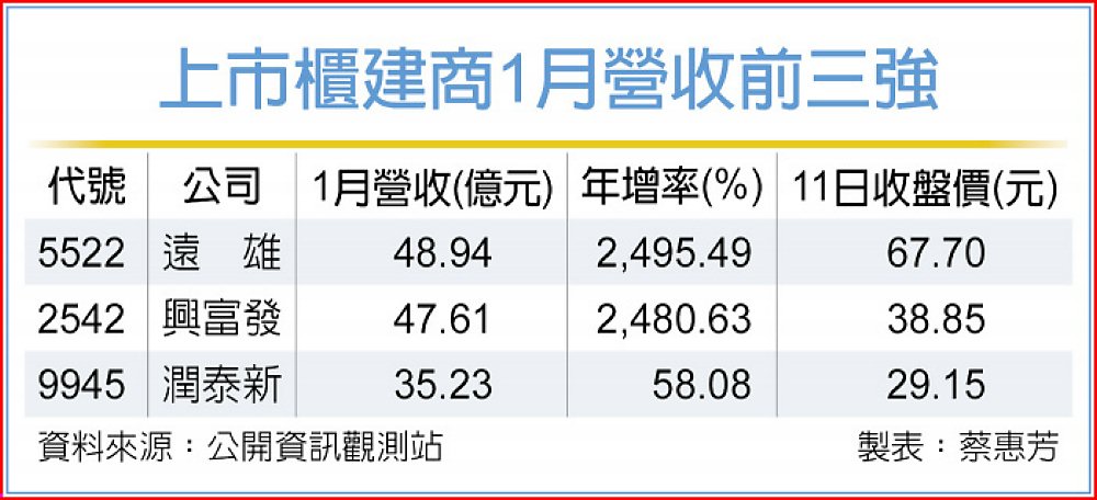 交屋潮帶動下,新年首月上市櫃建商營收排名大洗牌,遠雄(5522)以48.94億元超車興富發(2542)的47.61億元,躍居「營收王」,潤泰新(9945)以35.23億元躋身前三強。市場預期,春節連假後交屋潮將延續爆發,部分營建股第一季業績可望「馬上發財」。