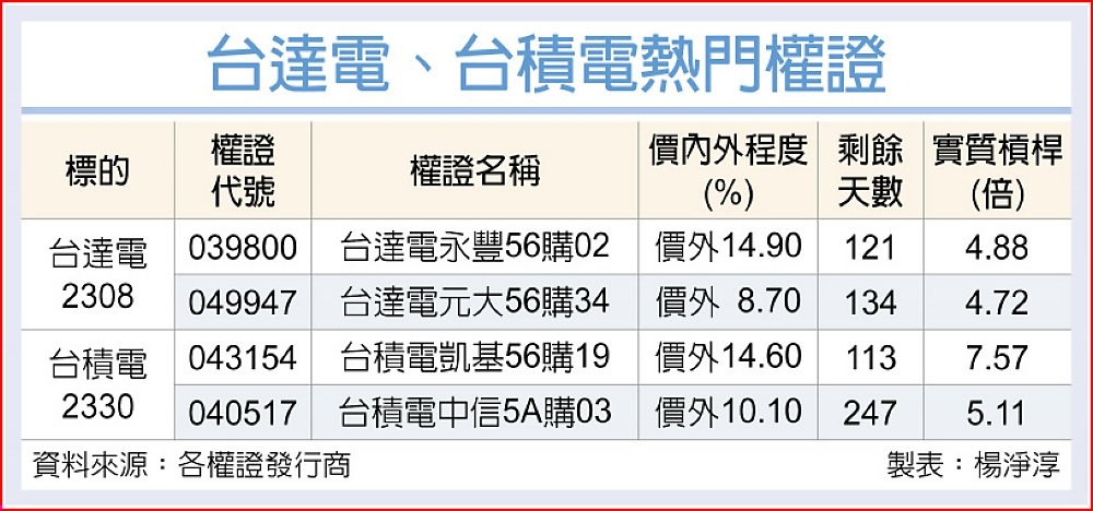 台達電、台積電相關權證中,台達電永豐56購02、台達電元大56購34、台積電凱基56購19、台積電中信5A購03等,剩餘天數在90日以上、槓桿倍數相對高,來到4~7倍以上、且買賣價差比相對較低。