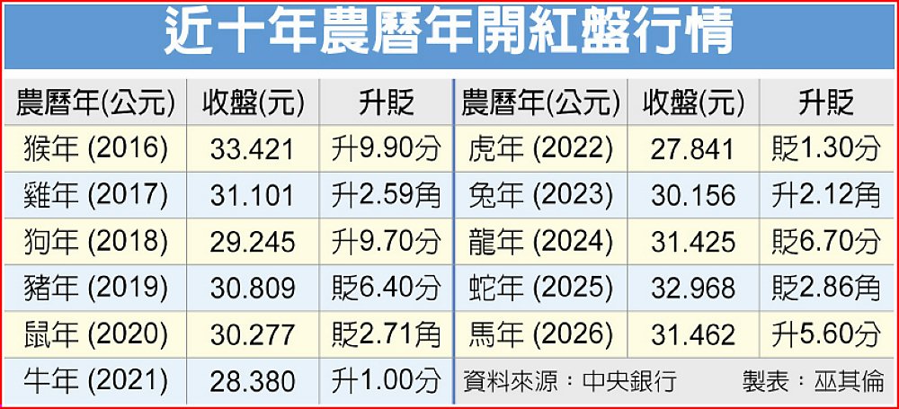 根據央行統計,2017年以來的過去十年,新台幣開紅盤表現升貶互見,其中五年升值、五年貶值,金馬年開紅盤小升5.6分,終止連二年開紅盤收黑。