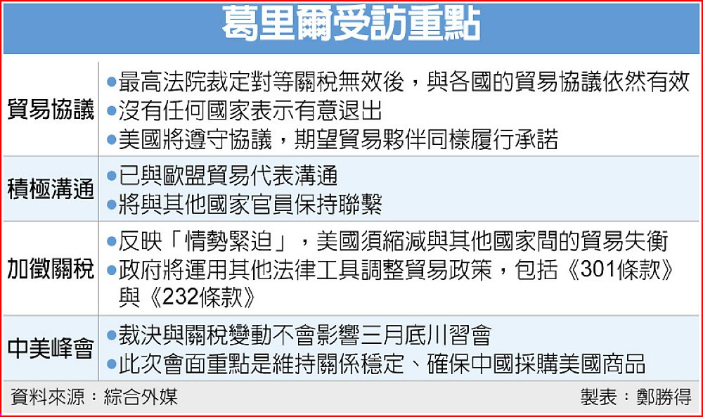 美國貿易代表葛里爾(Jamieson Greer)22日受訪時表示,儘管最高法院推翻對等關稅措施,但美國與歐盟、中國等達成的貿易協議依然有效。目前沒有任何國家表示有意退出協議。