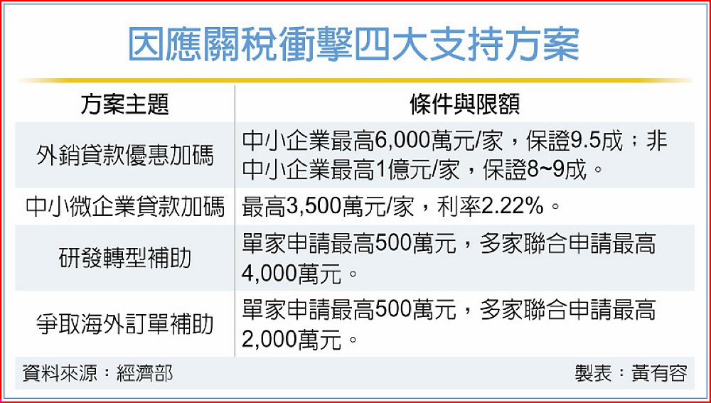 經濟部的四大支持方案,自2025年8月7日就開放全面受理申請,包括:外銷貸款優惠保證加碼、中小微企業多元發展專案貸款加碼、研發轉型補助,以及爭取海外訂單補助。
