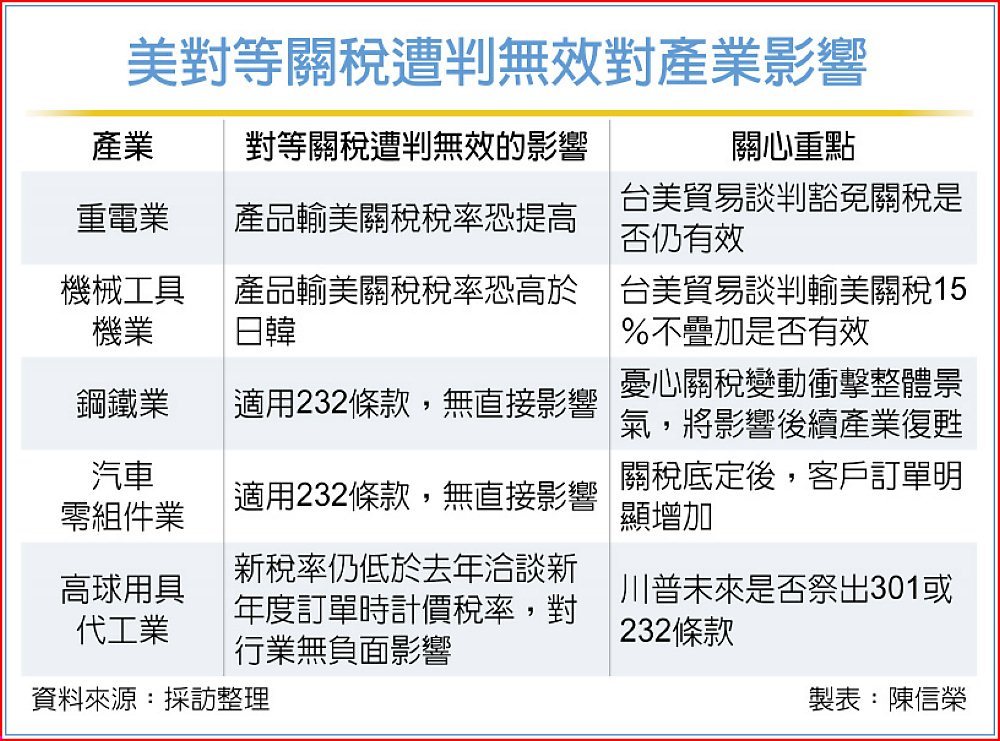 美國對等關稅遭判無效,農曆年前因台美簽訂貿易協定而大開香檳的重電、機械工具機產業,年後陷入「茫然」的處境,急向政府有關單位討答案,就擔心萬一台美貿易協定與對等關稅一同失效,將衝擊產業輸美競爭力。