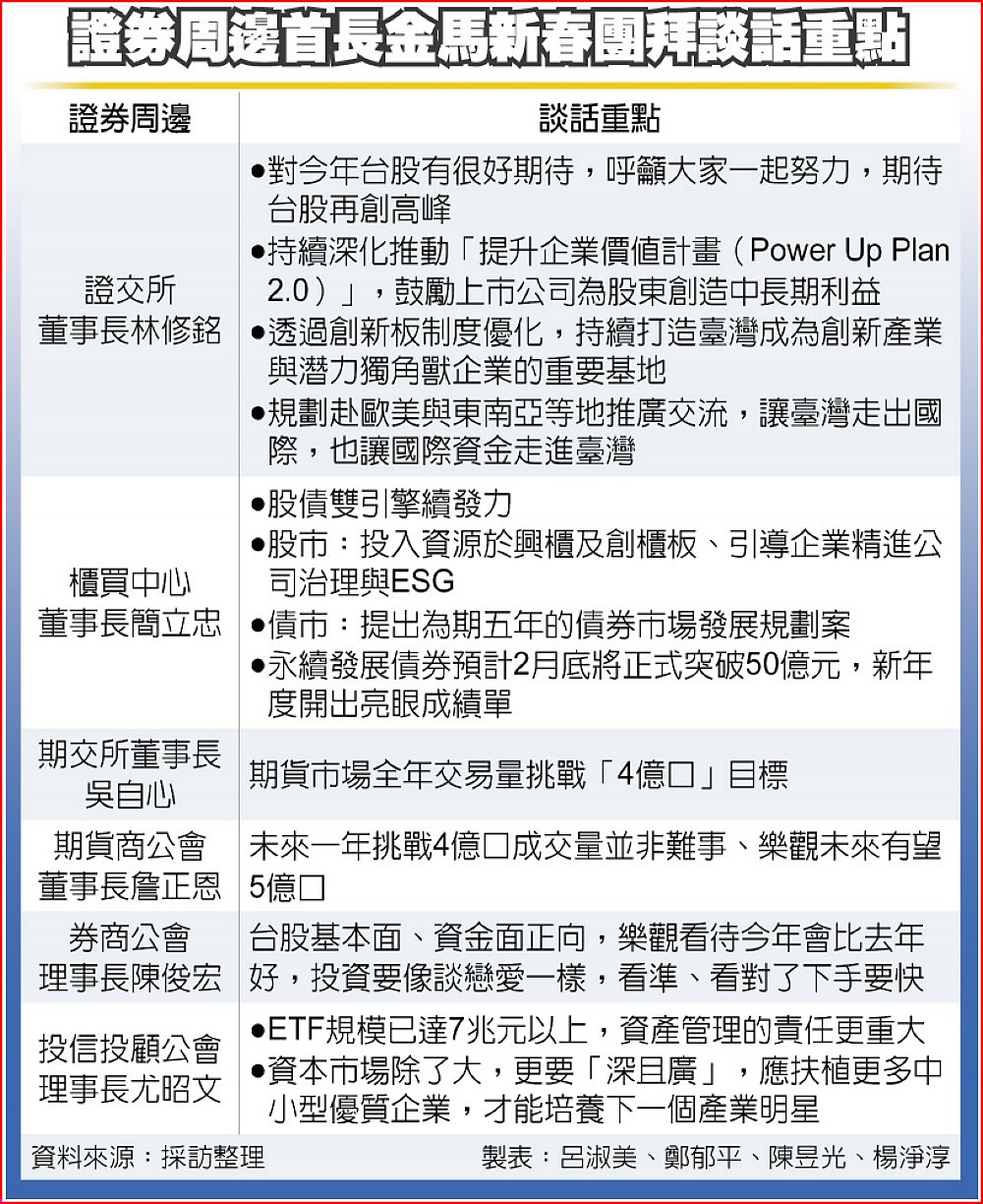 臺灣期貨交易所董事長吳自心則說,現貨市場已站穩在30,000點以上,期盼期貨市場朝今年能穩健向前,達成期盼已久「4億口」的目標。
