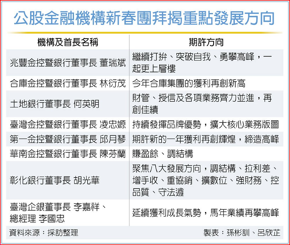 金馬迎春、開工首日,公股金控、銀行新春團拜紛紛宣示最新發展方向,目標都是持續成長,期許今年再創高峰。